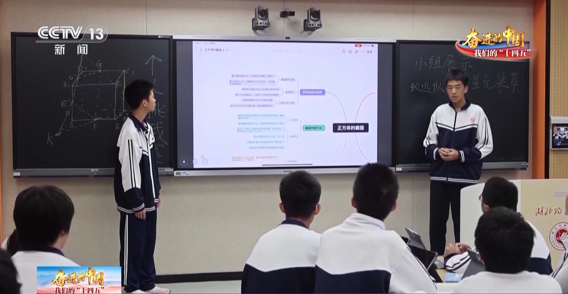 这是吉信第一高中的数学课“求立方”。只需轻触屏幕,即可在电子白板上自由旋转或裁剪 3D 图形。学生不仅可以直观地认知“几何空间”,还可以通过智能平台生成思维导图、整理知识点、进行个性化练习。老“黑板+粉笔”课堂om环境正在悄然发生变化。