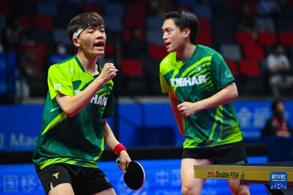 11月16日,澳门队王军/陈子贤(左)在比赛中庆祝进球。在双打比赛中,他们0-3不敌浙江太阳队。...